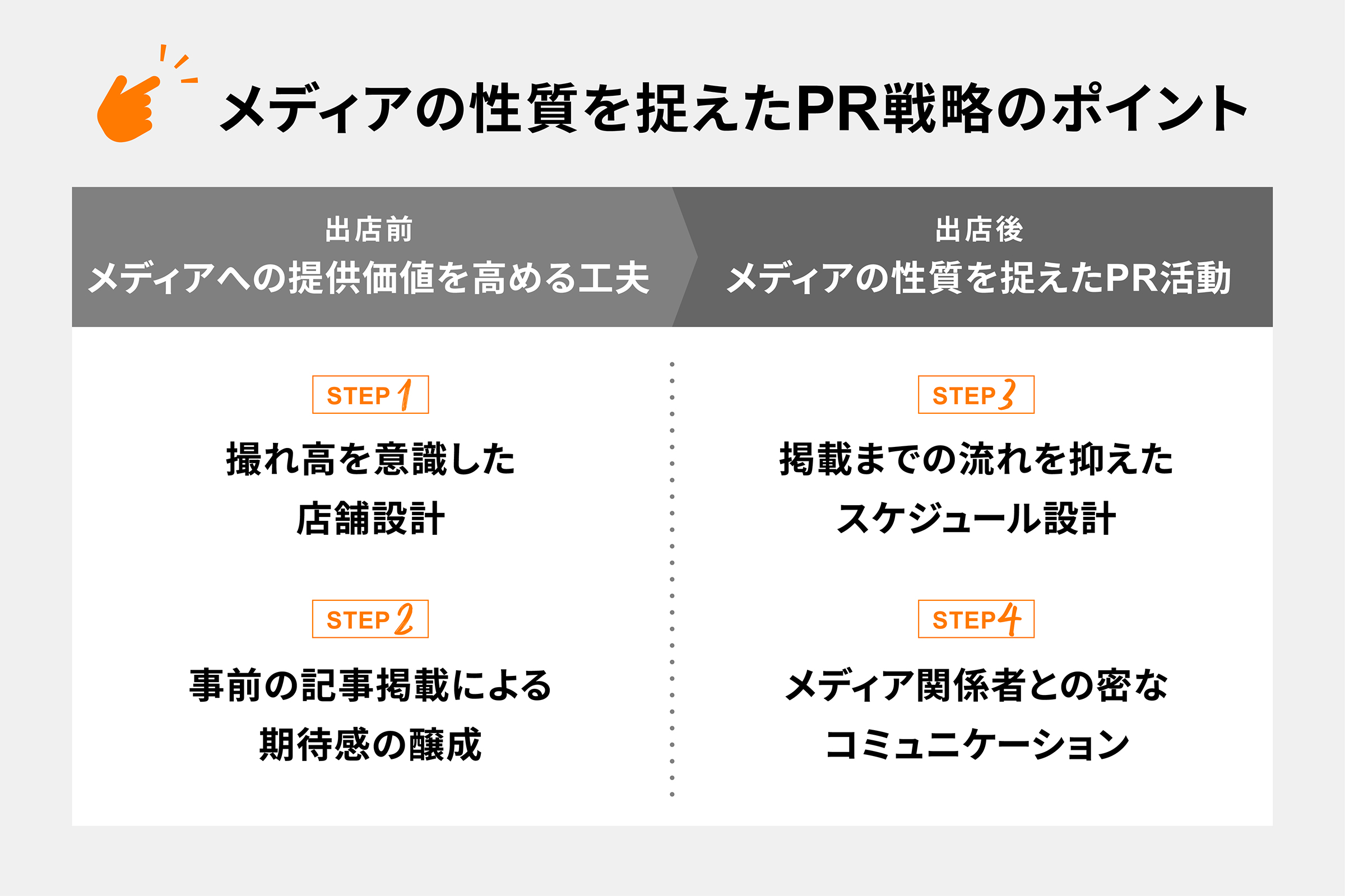 そこで、魅力的な店舗や商品を提供することはもちろん、マスメディアの性質を考慮して工夫することで、掲載いただきやすい状況を目指しました。